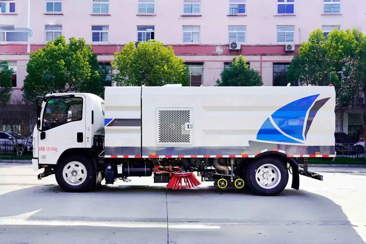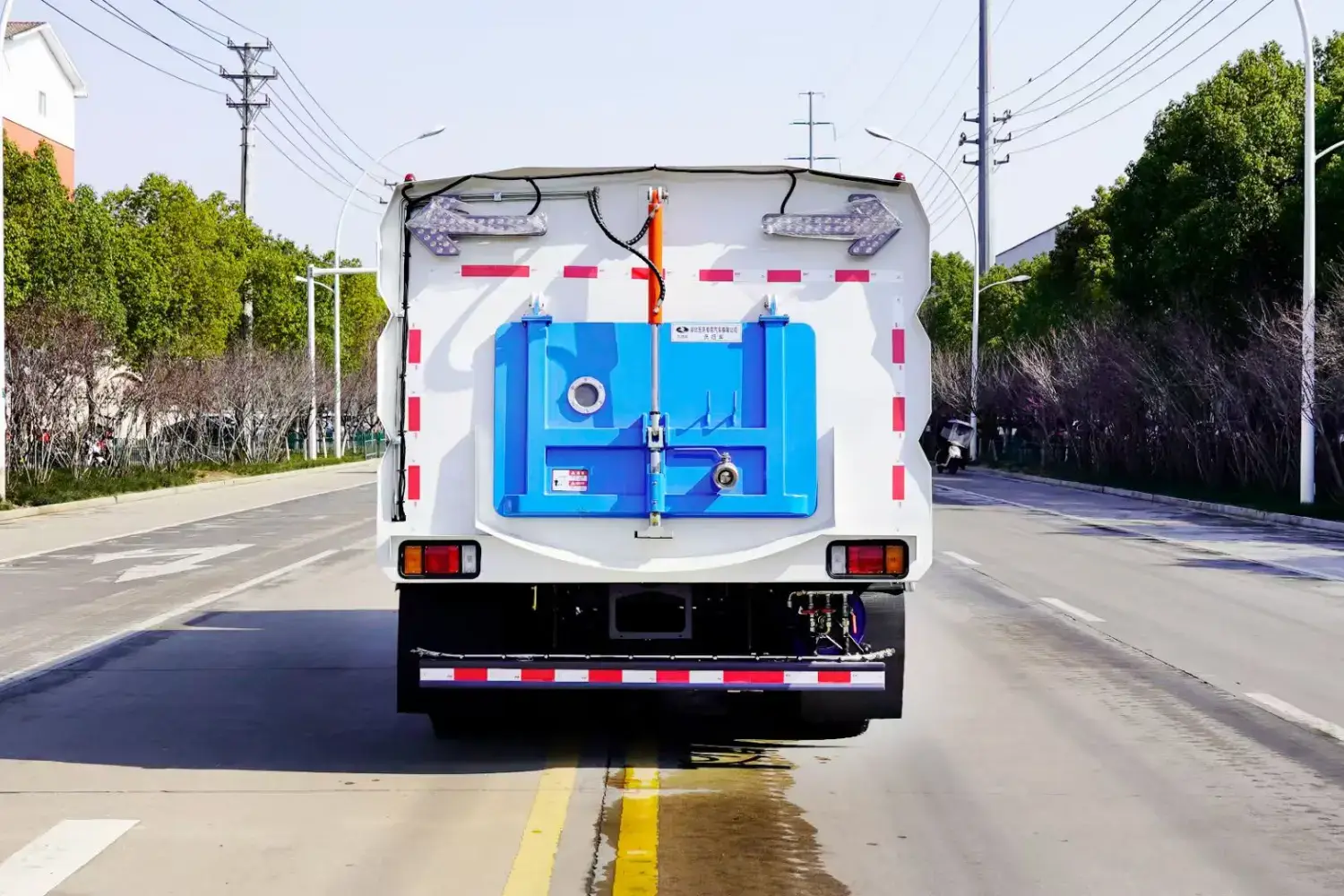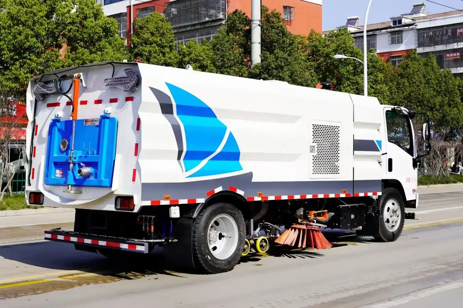 Superstructure Configuration: Auxiliary engine, blower, high-pressure water pump, 6 cubic meter clean water tank, 6 cubic meter waste bin, left and right side brushes, wide suction nozzle with spray bar, low-pressure flushing system, sweeping disc dust suppression system, hydraulic system, dedicated device electronic control system and subframe, etc. The auxiliary engine is a Cummins 140 horsepower engine, with 2 centrally mounted sweeping discs, hydraulic motor, GTM40 high-pressure water pump, high-pressure curb cleaning nozzles, universal front corner spray, counter-flushing, rear spray, waste bin self-cleaning, stainless steel high-pressure piping, CAN bus control, rear LED arrow lights, 15-meter high-pressure car wash reel, waste bin and water tank with overflow and low water level alarm devices, and indoor monitor for reversing and sweeping status!